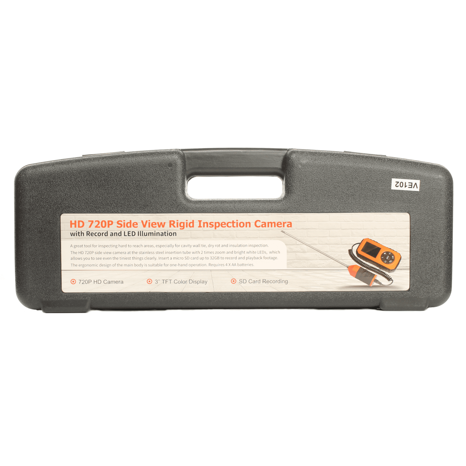 Deze video endoscoop is geschikt voor bouwkundig onderzoek en beschikt over een rechte probe en zijwaartse camera. Het 5 inch display zit middels een kabel verbonden aan de camera.