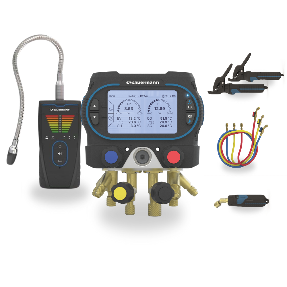 - Voor koeltechniek: compleet uitgerust voor controle, onderhoud en lekkagedetectie bij koelinstallaties