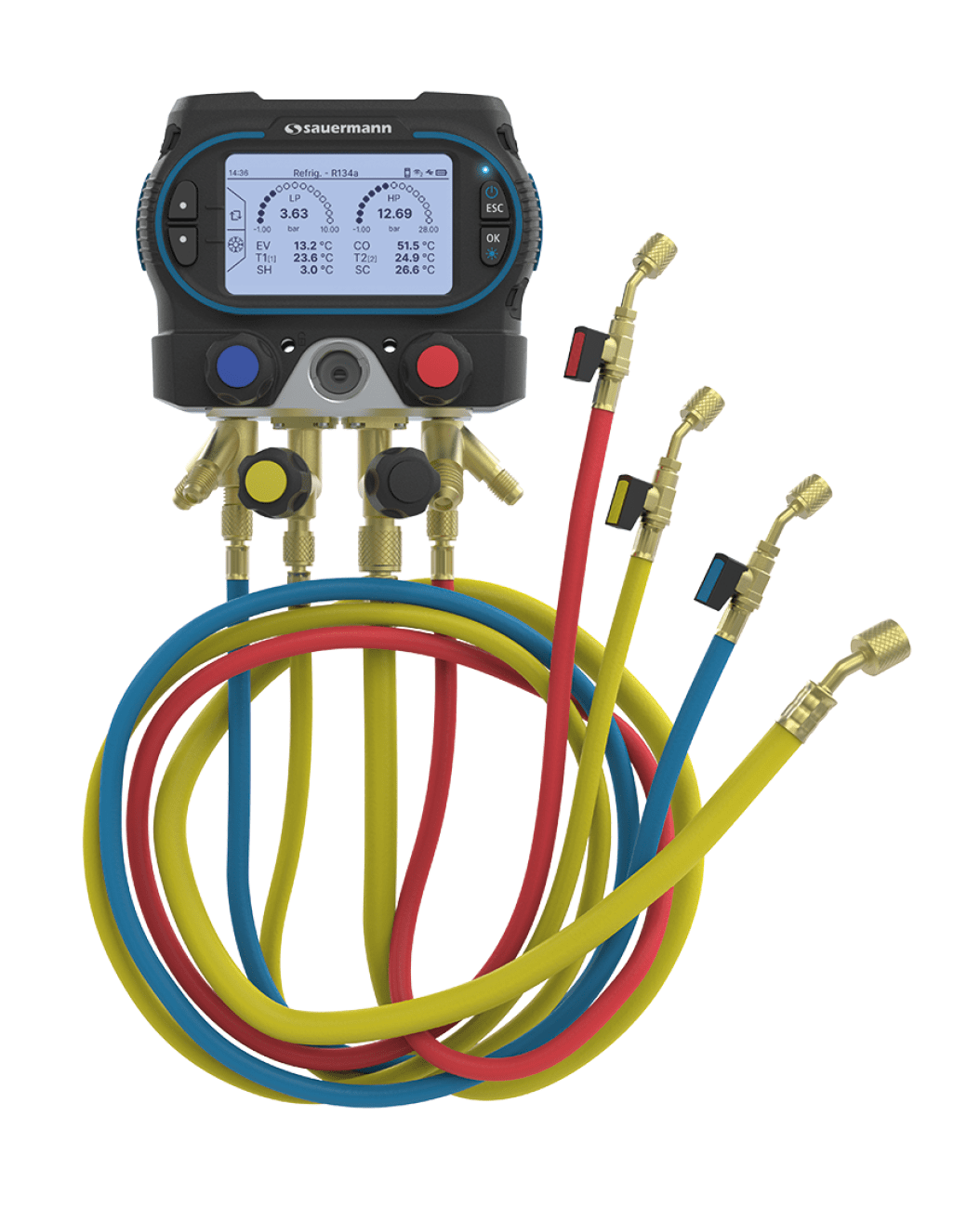 De manifold is geschikt voor meer dan 130 koudemiddelen (A1 / A2L / A2 / A3) en ondersteunt automatische berekeningen zoals oververhitting, onderkoeling en efficiëntie (COP/EER). Via Bluetooth koppel je moeiteloos met draadloze accessoires, zoals temperatuurklemmen, druk- en vacuümsondes.