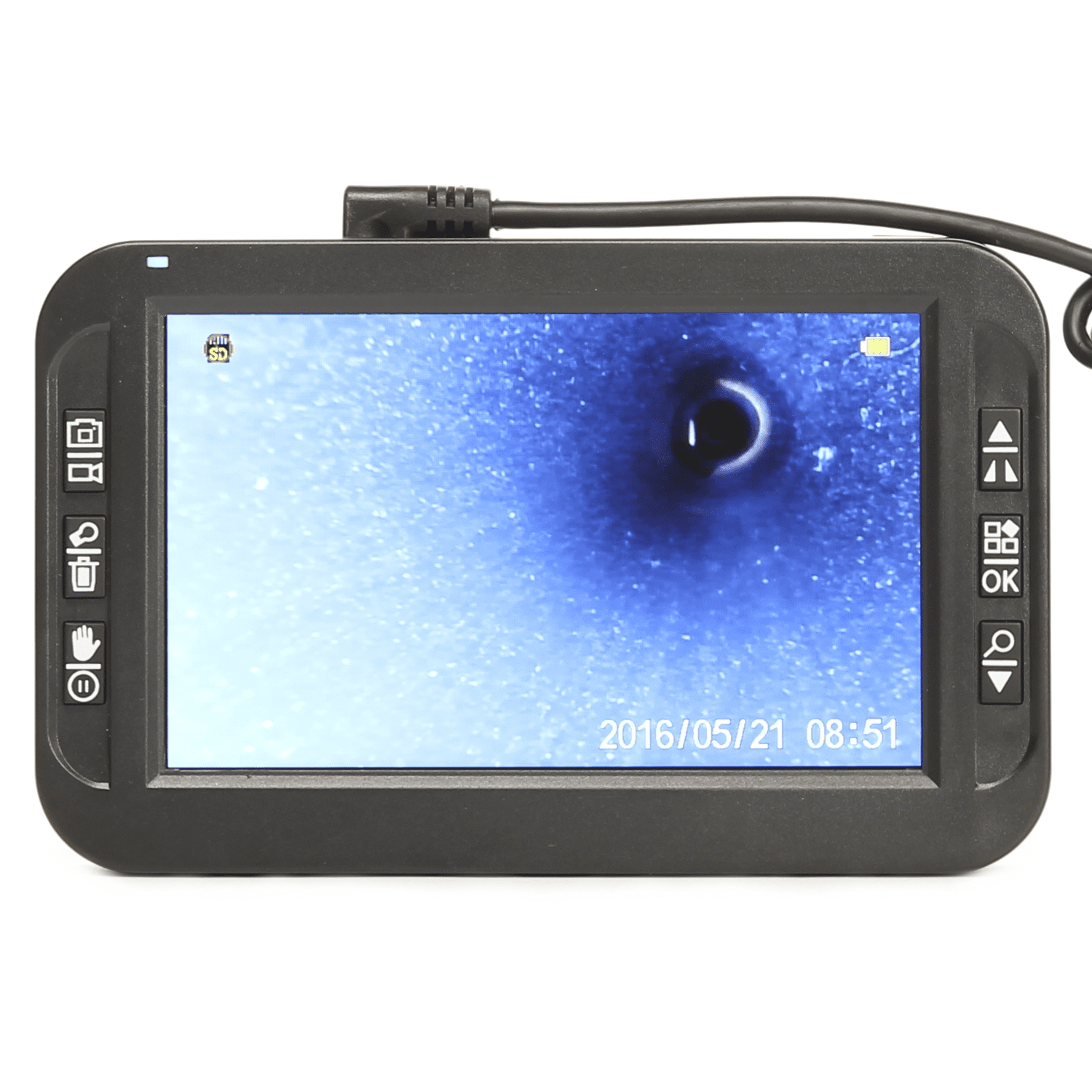 Handzame endoscoop ideaal voor bouwkundig onderzoek (spouwmuur, boven plafonds, houtrot). Set bestaande uit een RVS lans met zijwaartse camera (met 2 power LED's) en 5 inch LCD display middels een kabel verbonden met de camera. Lans lengte 30cm, diameter 9mm, beschermingsklasse IP67. Met behulp van de power LED's is het zicht ongeveer 1,5m. Zowel de camera als het LCD display zijn batterij gevoed en kunnen middels netadapter worden opgeladen. Het LCD display ondersteunt MicroSD kaarten tot max 32Gb voor opslag van plaatjes en video beelden