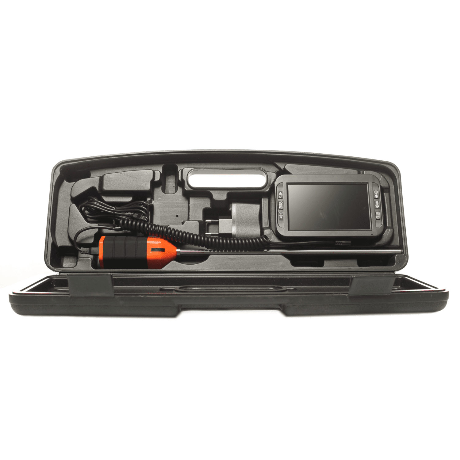 Deze video endoscoop is geschikt voor bouwkundig onderzoek en beschikt over een rechte probe en zijwaartse camera. Het 5 inch display zit middels een kabel verbonden aan de camera.